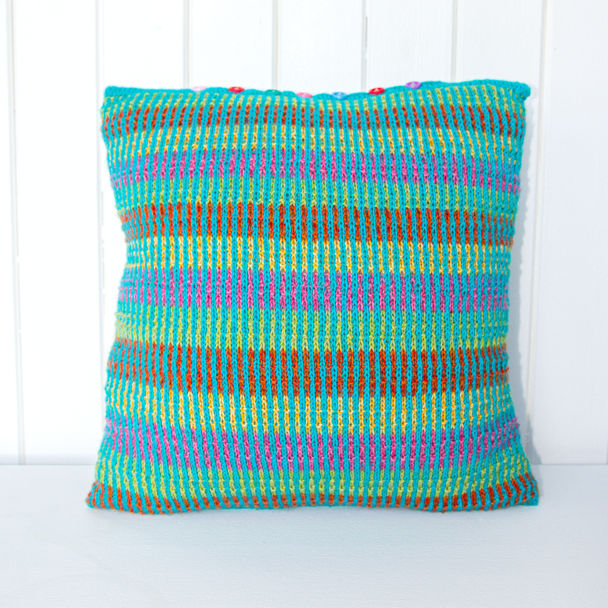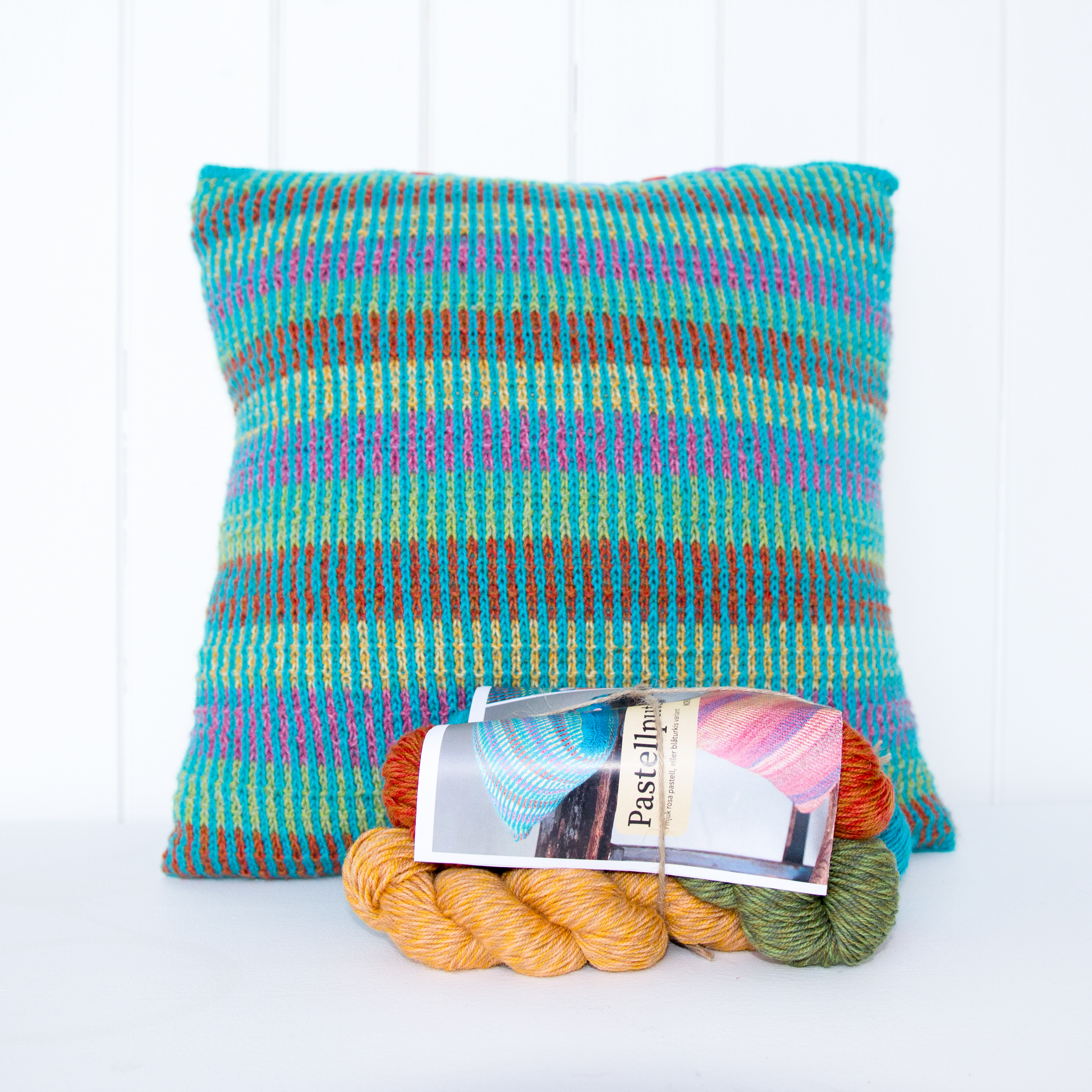 The pastel pillow is a knitting set with yarn from the Textile industry museum in Salhus and a recipe from our designer Siri Angela Gamborg.