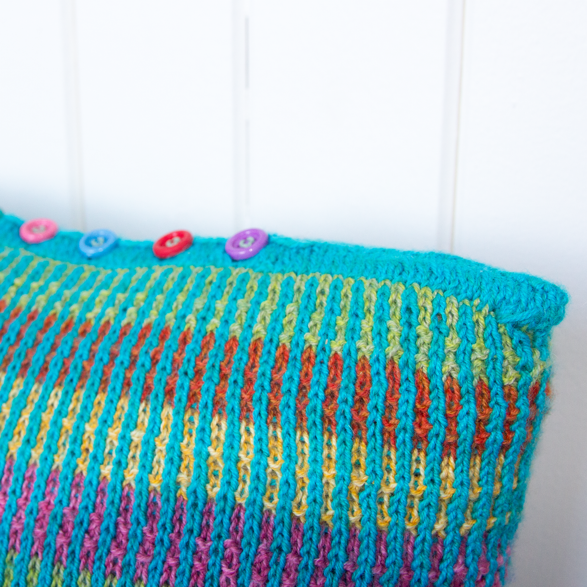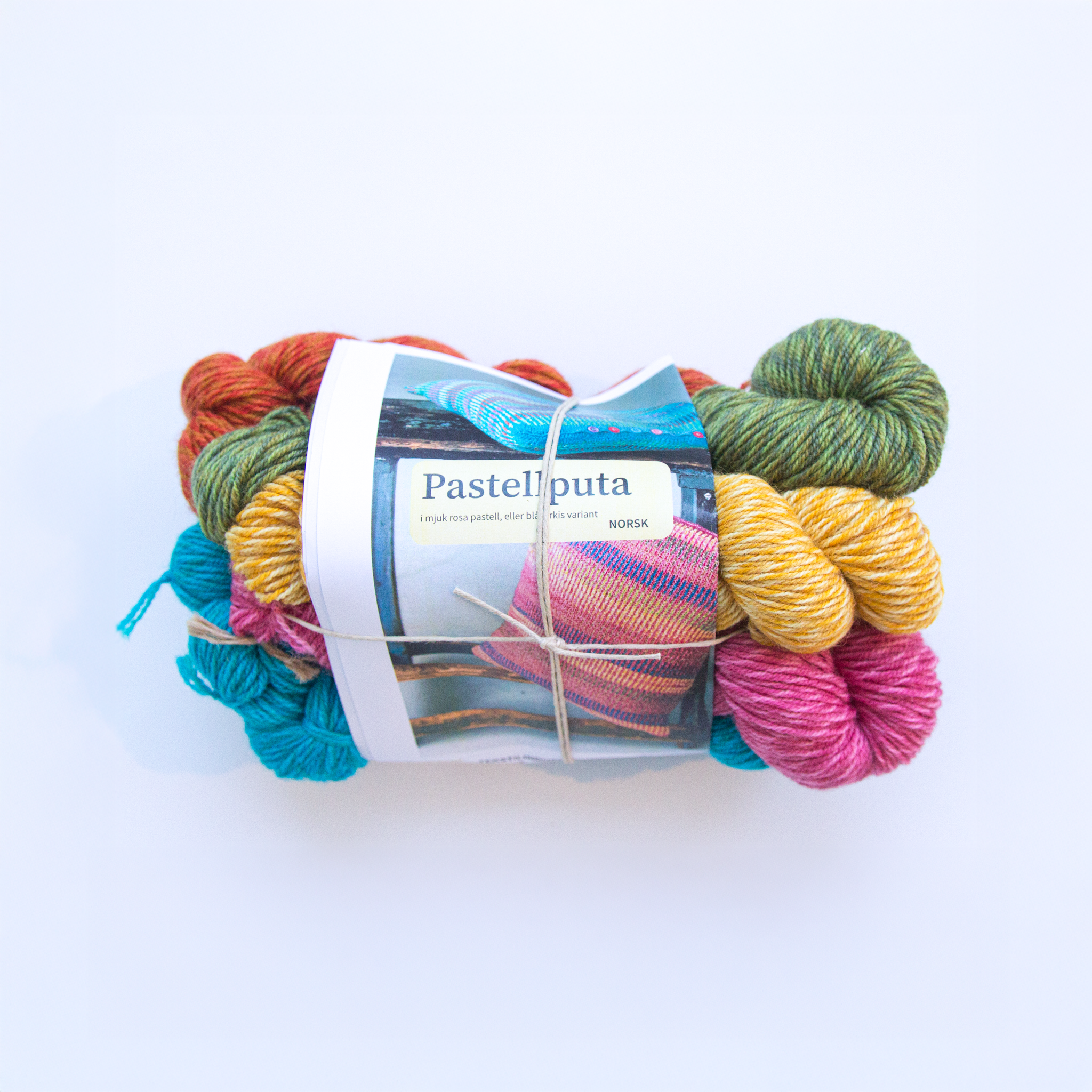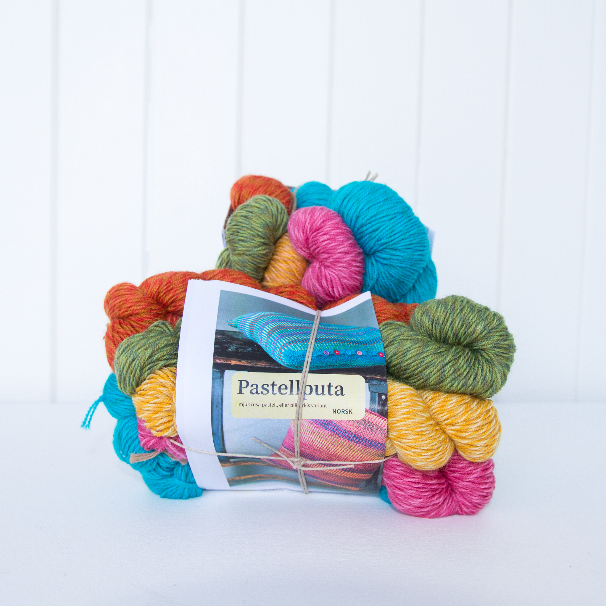 Pastellputa er eit sprekt mønster designa av Siri Angela Gamborg, og strikkast i museumstvinn frå Tekstilindustrimuseet.