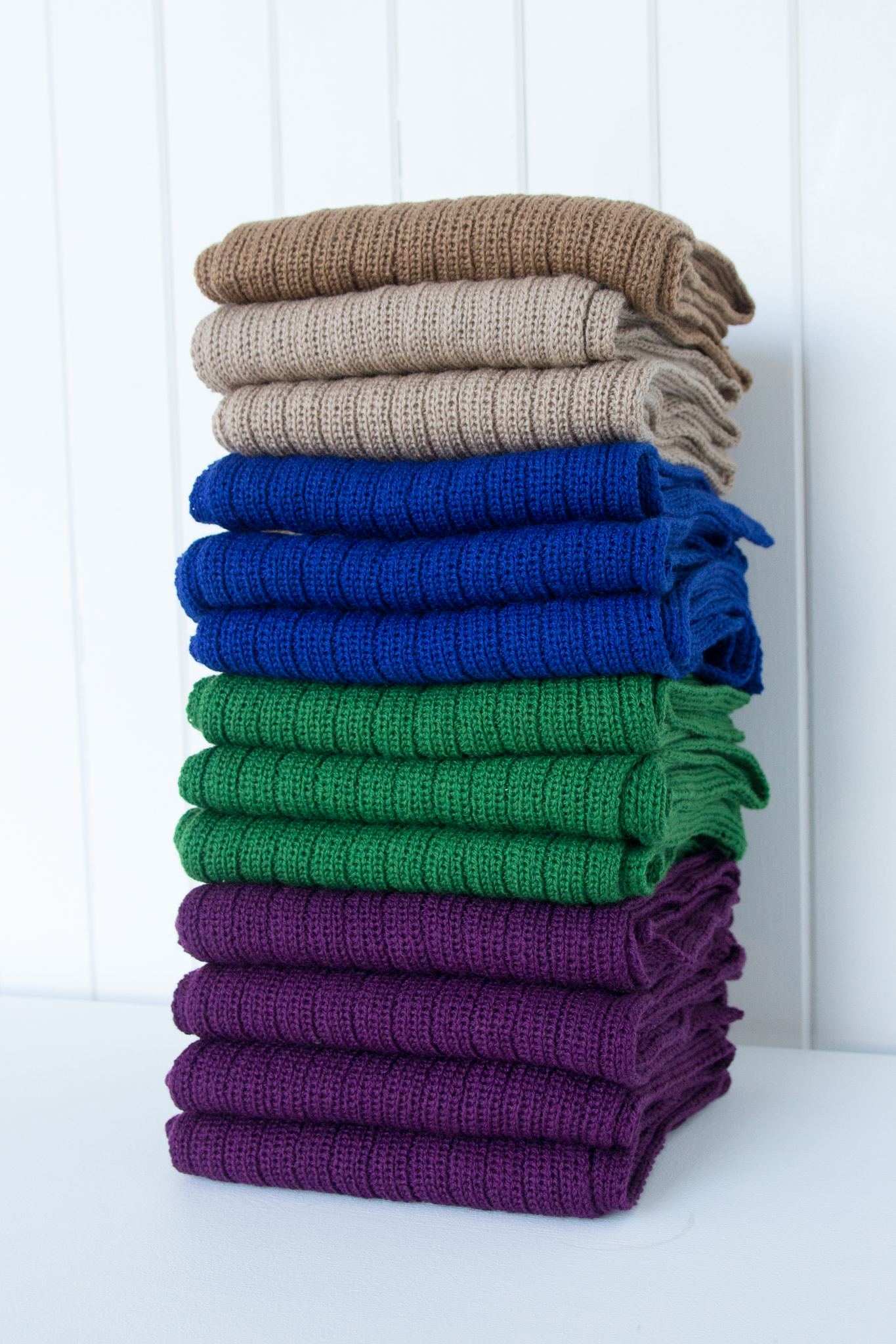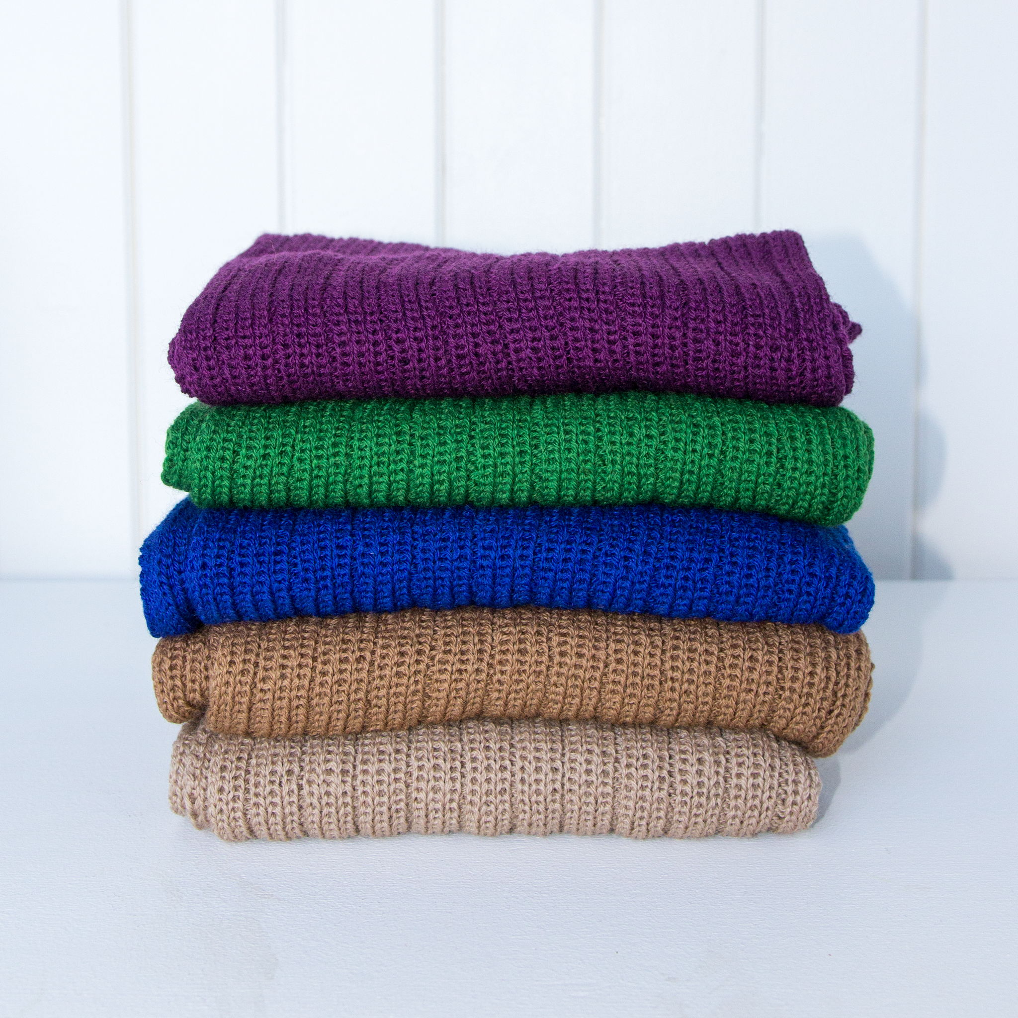 Scarves knitted in 100%wool. Knitted on a knitting machine in the former Salhus Tricotagefabrik.