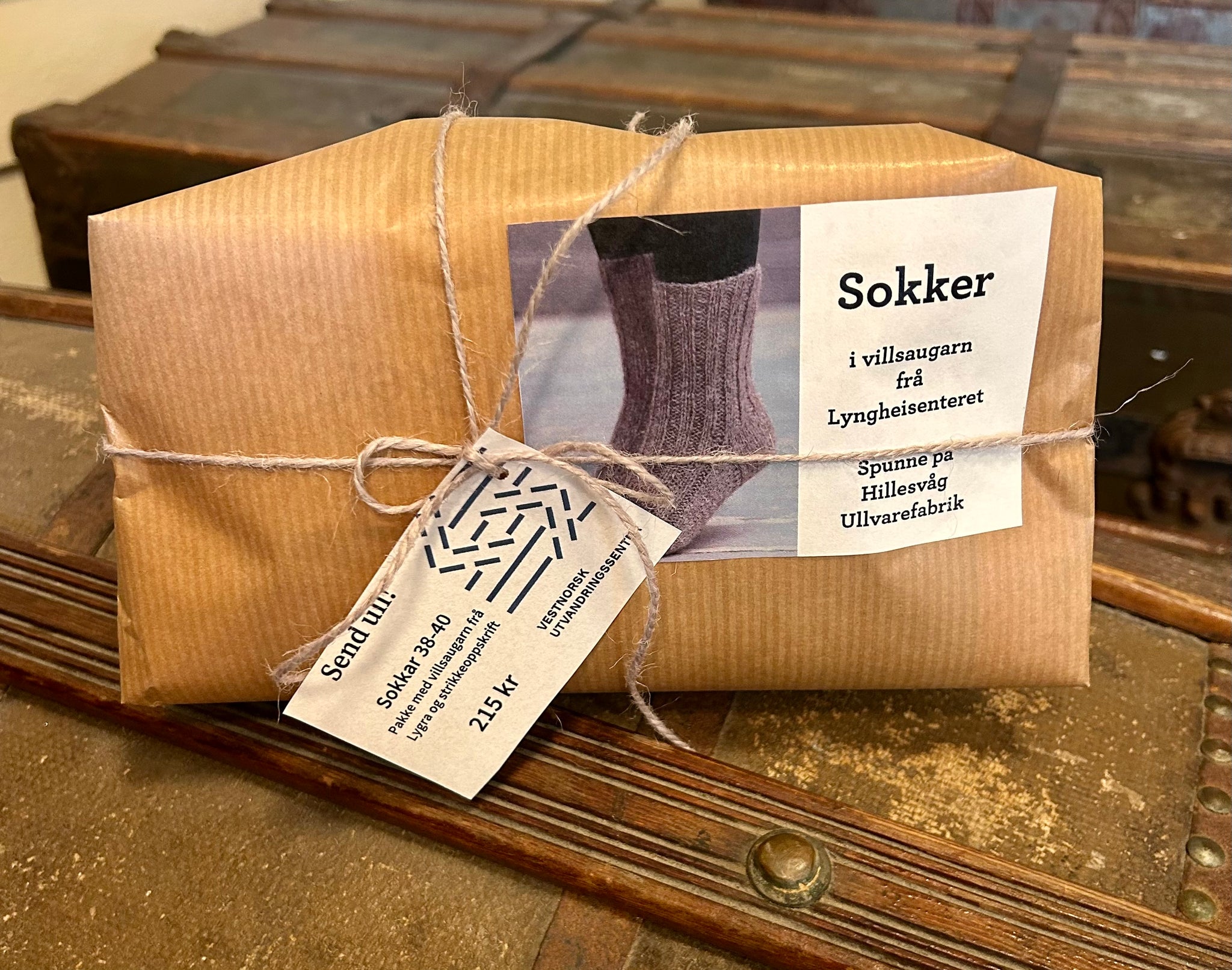 Strikkepakke med grått villsaugarn frå Lyngheisenteret og oppskrift frå Hillesvåg ullvarefabrikk.